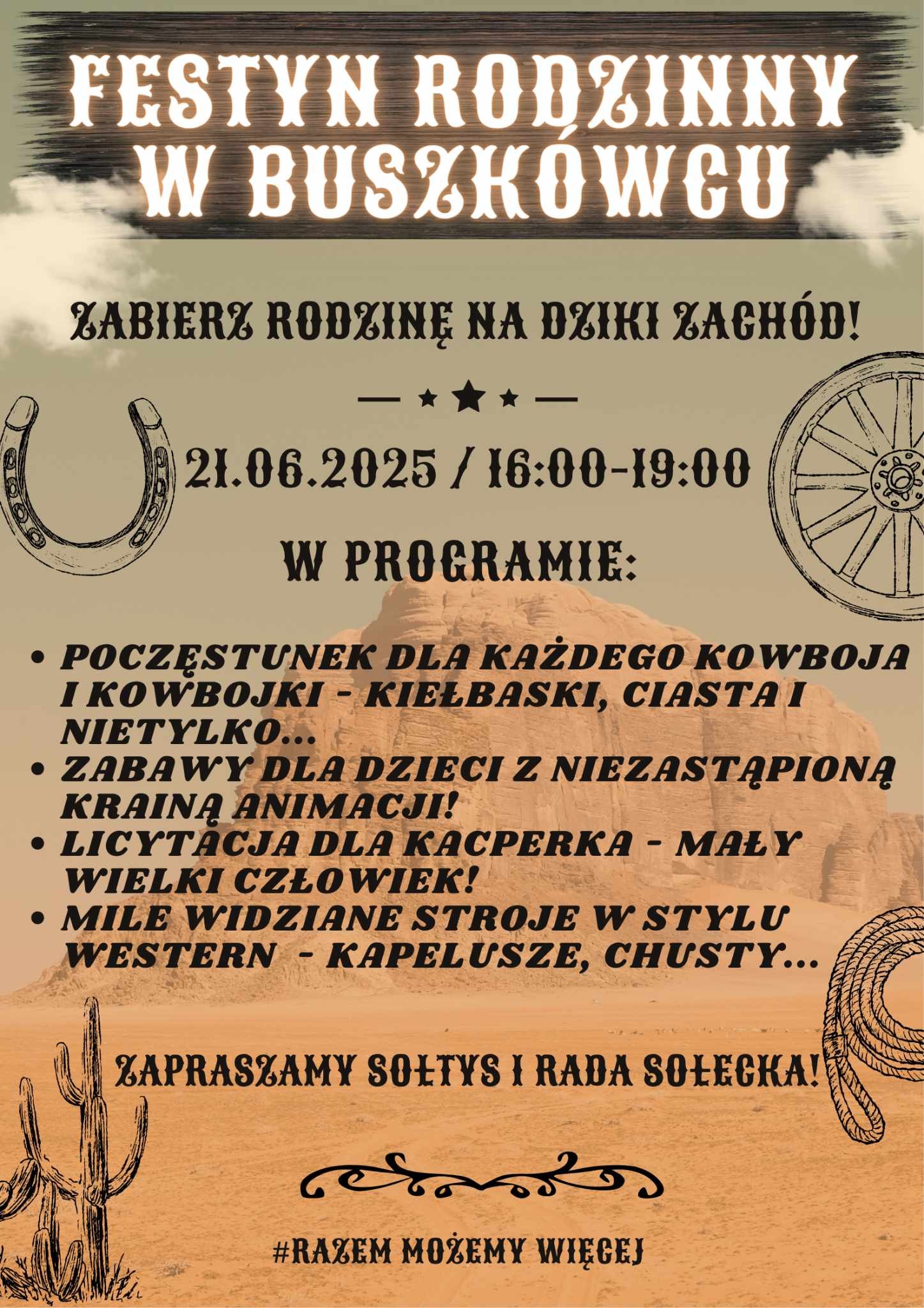 Festyn Rodzinny w Buszkówcu 17 czerwca, 2025 W imieniu Organizatorów serdecznie zapraszamy na Festyn Rodzinny w Buszkówcu Przygotujcie się na przygodę rodem z Dzikiego Zachodu