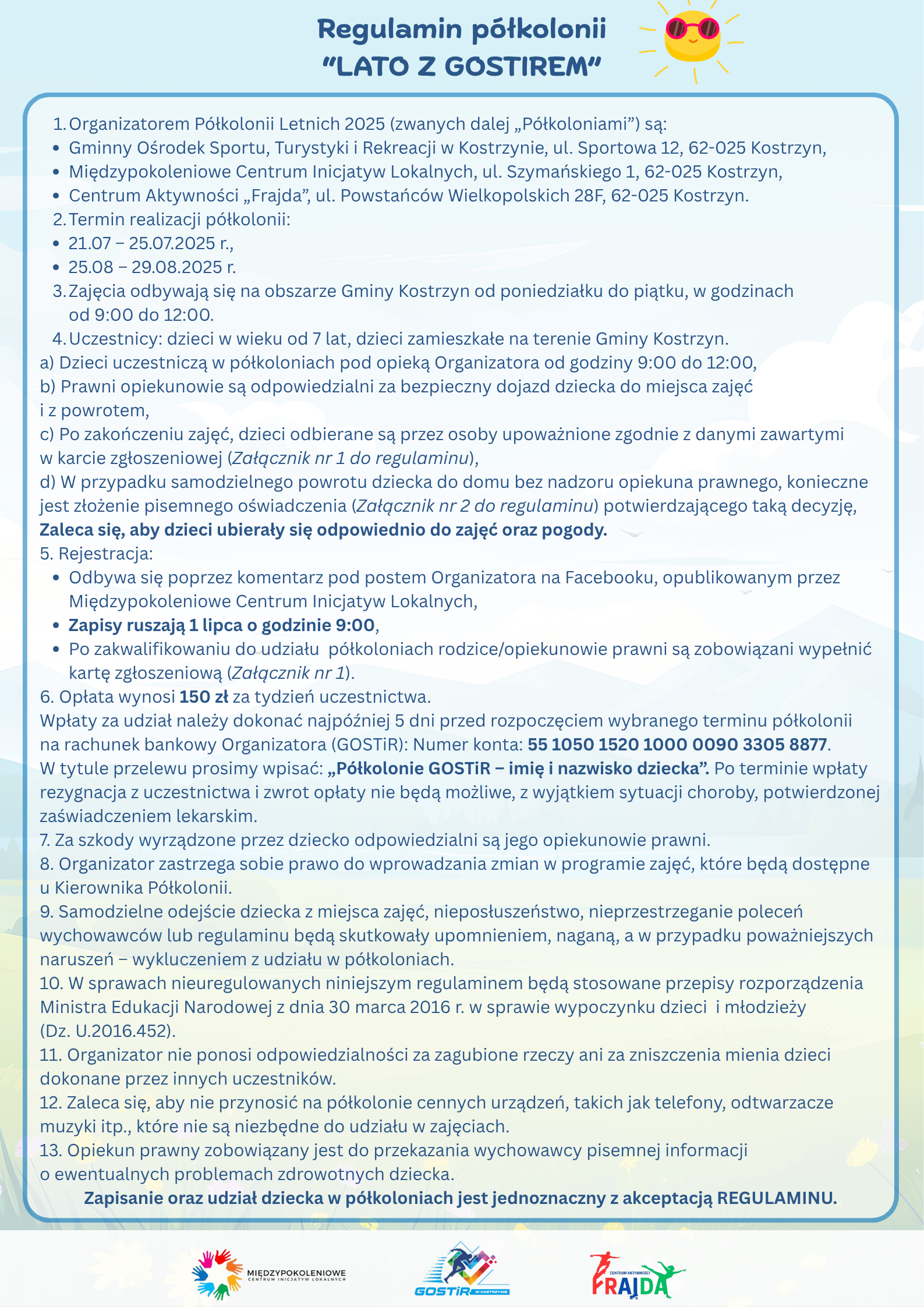 Poniżej przedstawiamy REGULAMIN PÓŁKOLONII oraz załączniki